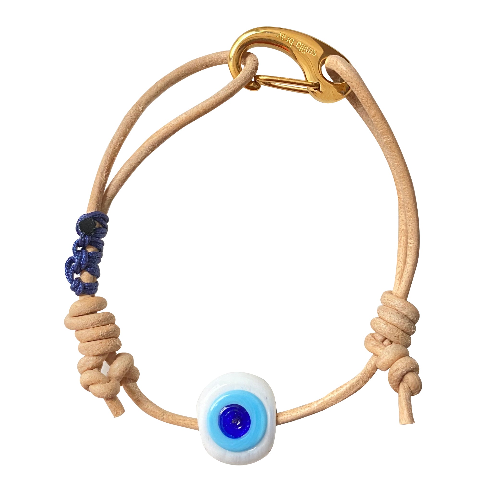 Featuring a striking blue glass nazar bead on soft nude leather cord, this bracelet blends traditional symbolism with a modern boho twist. Finished with our signature gold-plated clasp and hand-knotted blue macramé details, it’s a meaningful accessory made for everyday wear.
