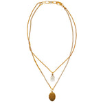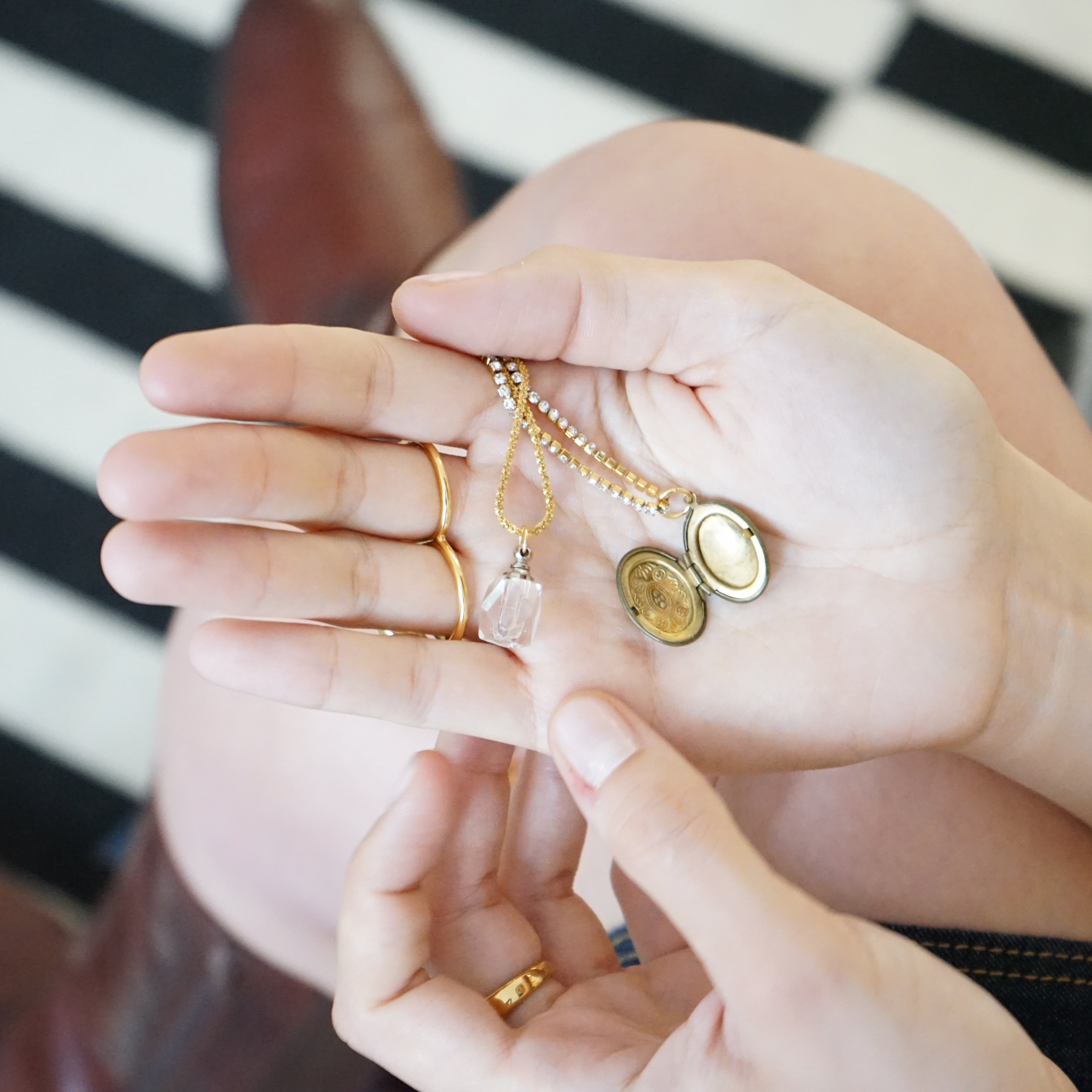 The Aura Necklace captures the magic of nostalgia and light. Handcrafted with a double-layered design, it pairs a vintage-style gold locket with a delicate glass treasure pendant — perfect for holding a tiny note, scent, or keepsake. Each layer is finished with gold stainless steel chains that shimmer beautifully in the light, creating a timeless yet contemporary look.