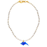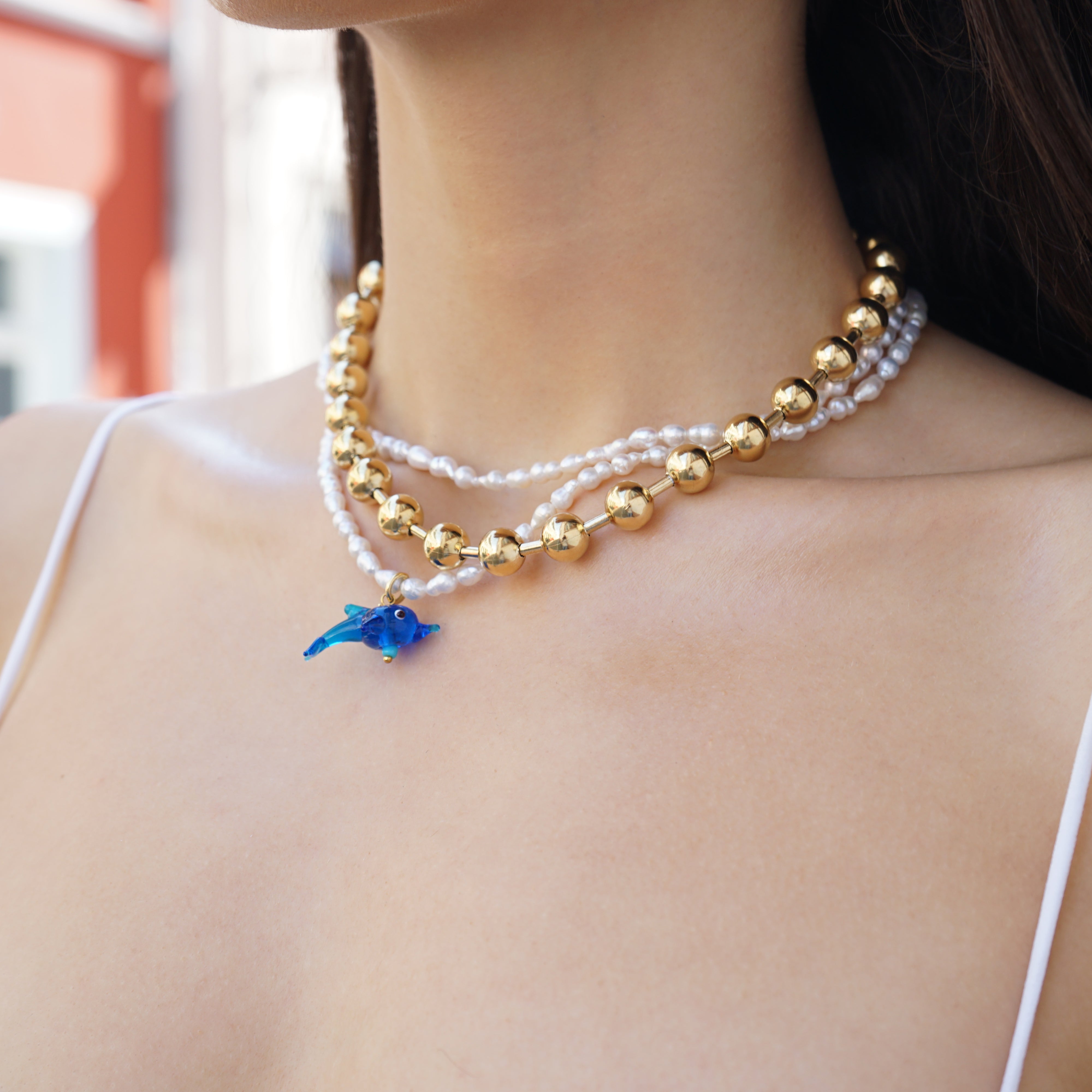 Dive into playful elegance with the Flipper Necklace, featuring natural freshwater pearls and a handcrafted blue glass dolphin pendant.