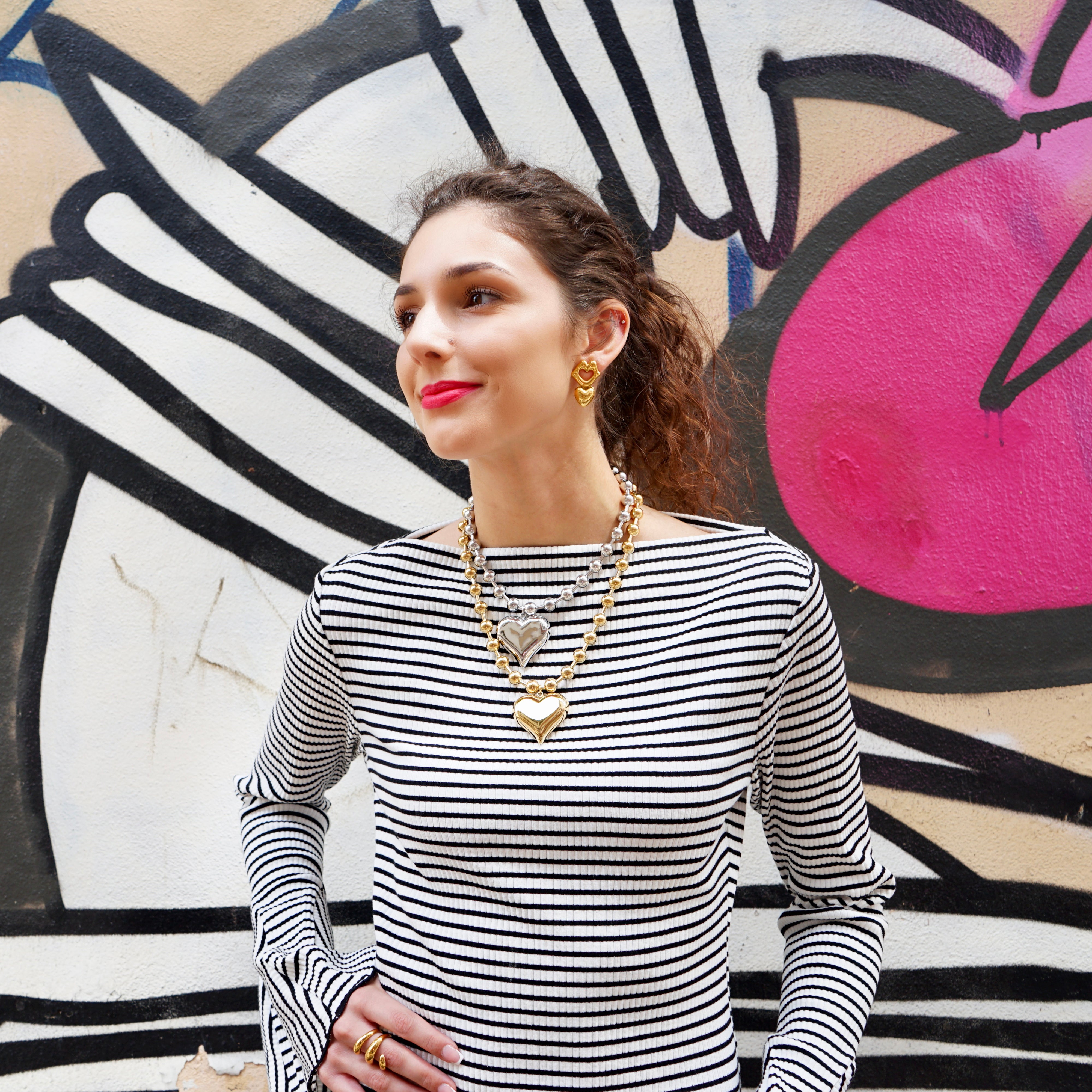 Turn heads with the Rebel Heart Necklace – a bold statement piece that brings runway energy to your everyday look. Featuring chunky gold-tone beads and a striking oversized heart pendant, this necklace is made to stand out. Whether layered with chains or worn solo, it adds instant cool-girl edge to any outfit.