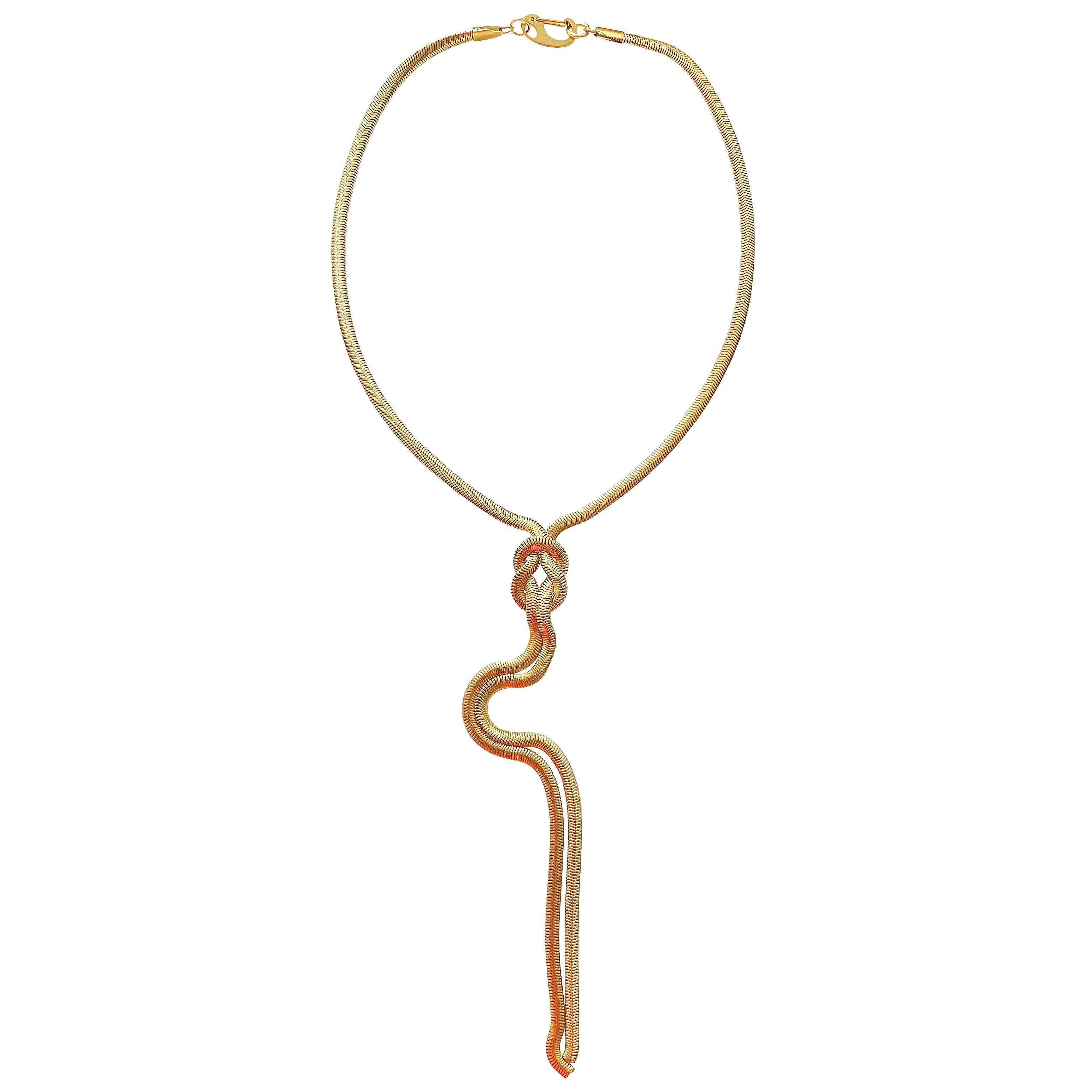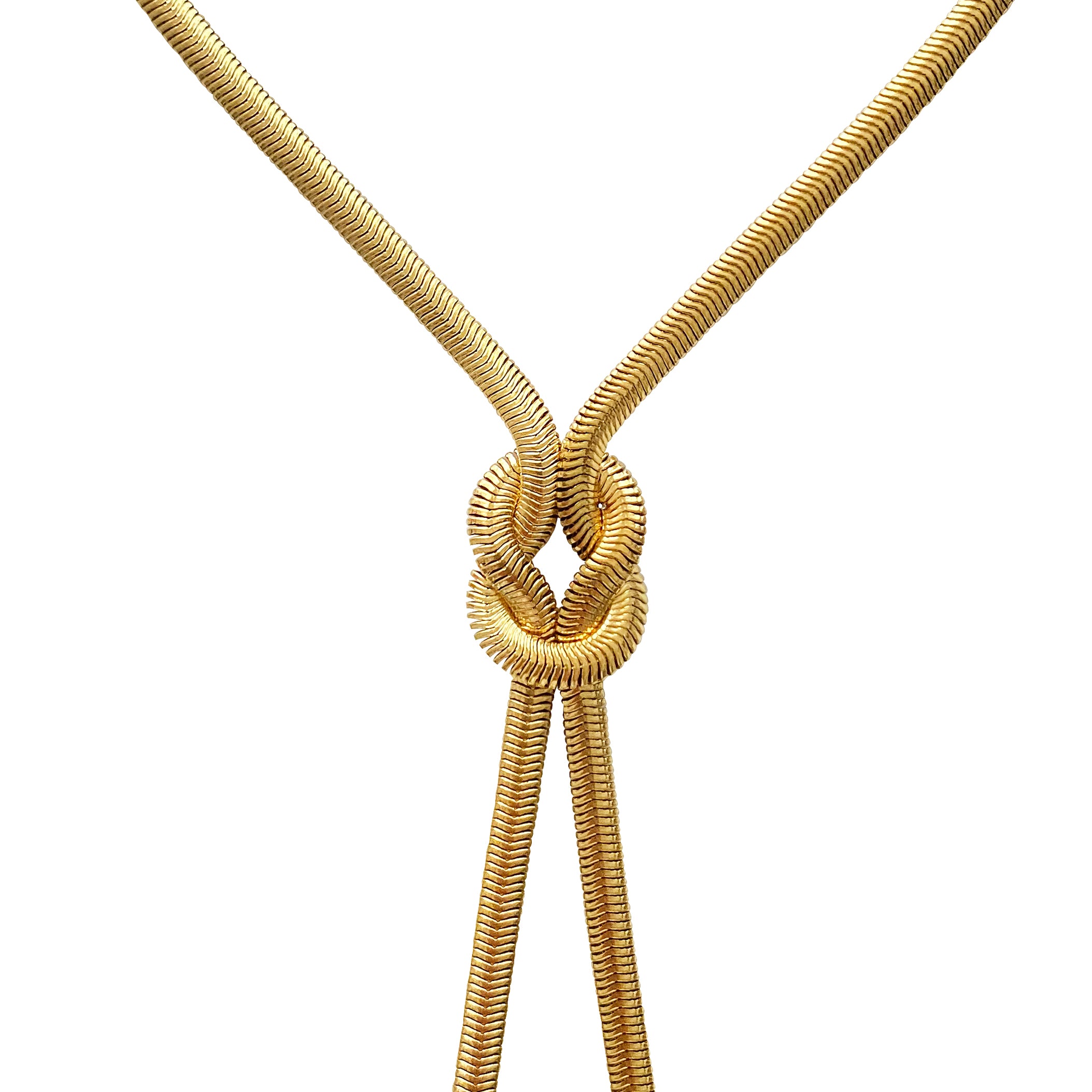 Our Seline Necklace is a statement of sculptural elegance — bold yet fluid. Crafted from gold-toned stainless steel, it features a sleek snake chain knotted at the center, creating an organic, flowing silhouette that moves gracefully with you.