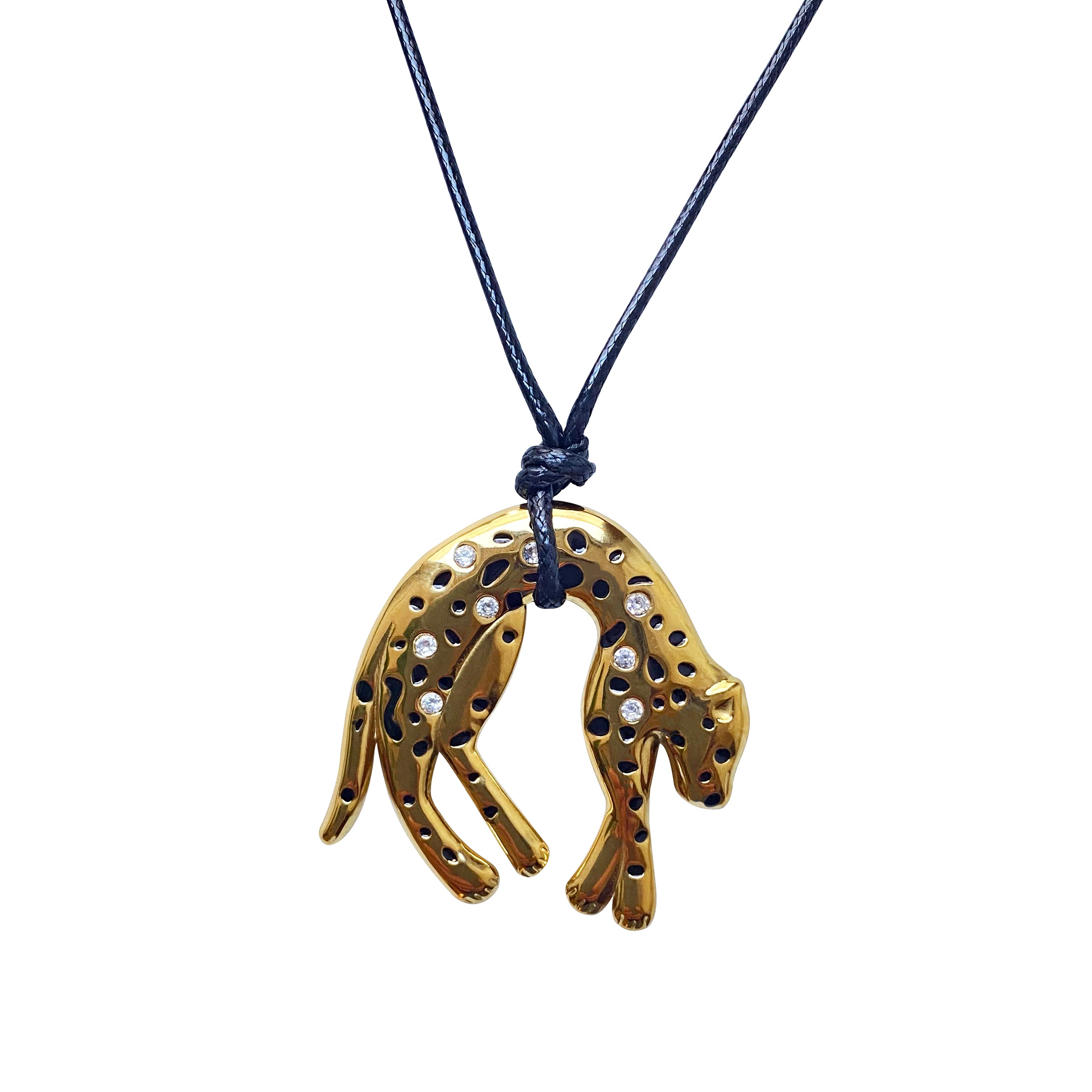 The Noir Panther Necklace is a statement of fluid strength and quiet elegance. Crafted from gold-plated stainless steel, the sculptural panther pendant is detailed with deep black enamel and subtle zirconia accents that add a refined sparkle. Suspended on a black cord, the design feels both raw and luxurious.