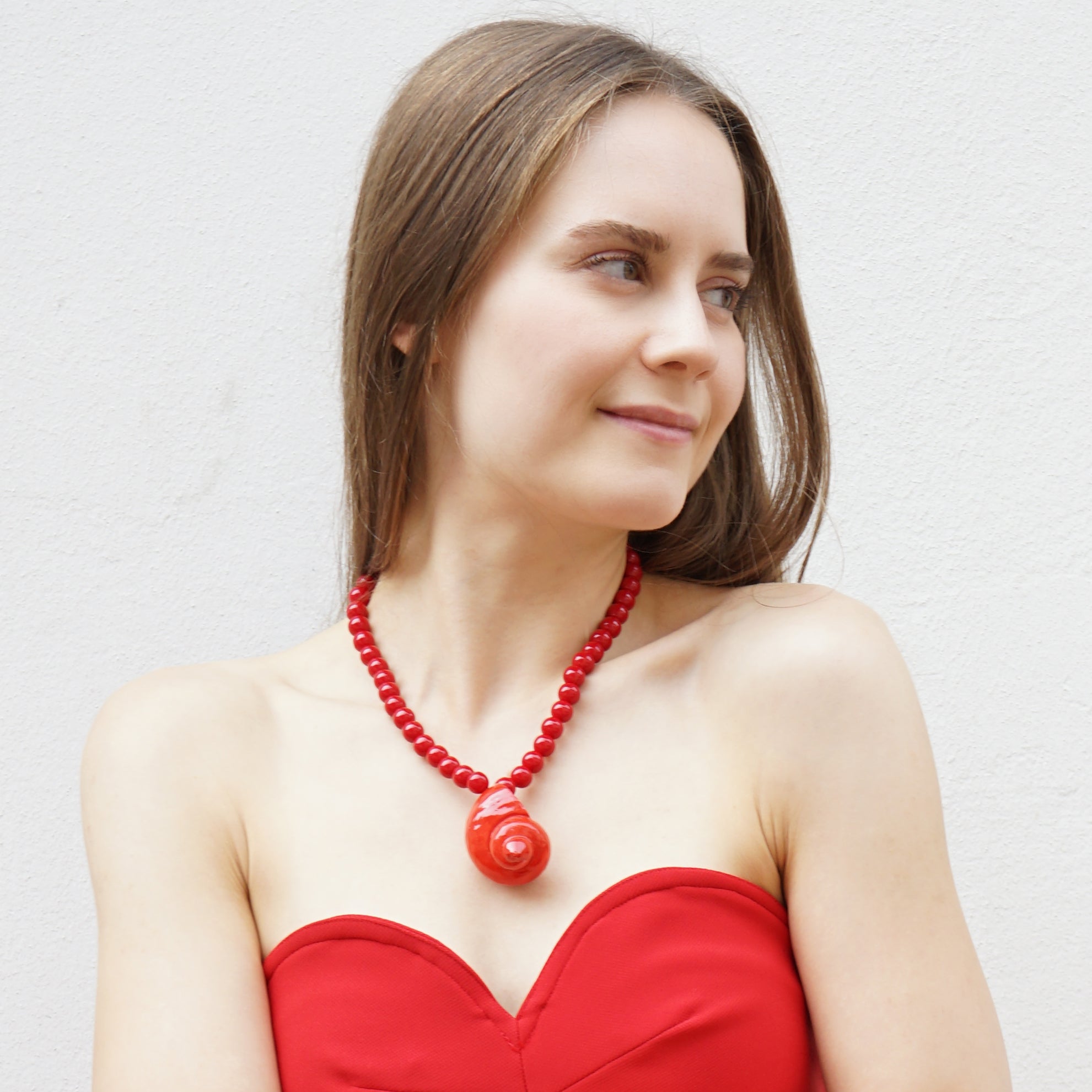 Add a splash of bold elegance to your jewelry collection with the red shell Sienna Necklace. Featuring hand-painted enamel and polished red jade gemstones, this statement necklace is finished with a striking shell pendant that embodies coastal beauty and modern design.