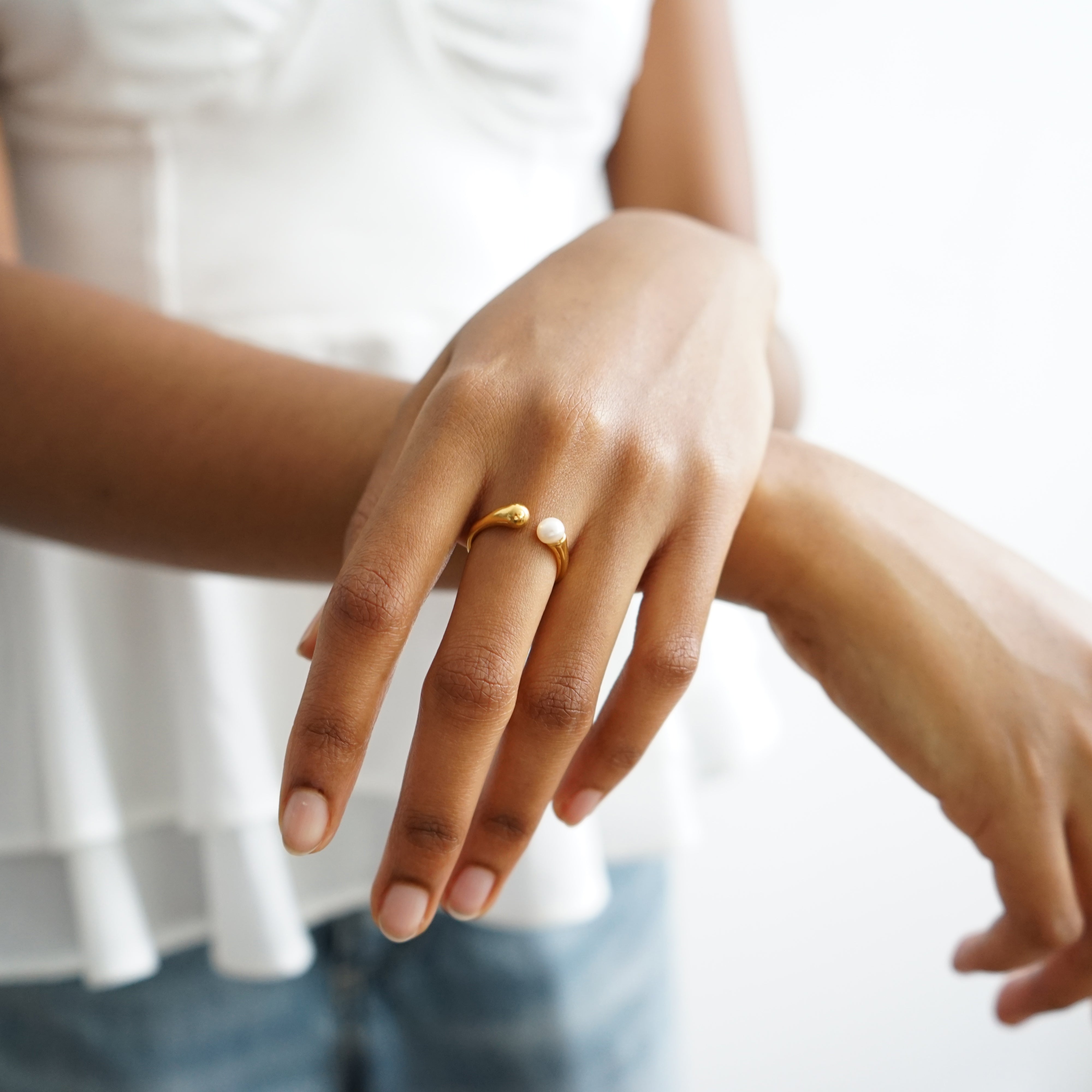 The Ring Mercy is a delicate balance of modern minimalism and timeless elegance. Crafted from gold-tone stainless steel, it features an open design with a single freshwater pearl that adds a soft, refined touch. Its adjustable silhouette makes it versatile and comfortable, perfect for stacking with other rings or wearing as a subtle statement on its own.
