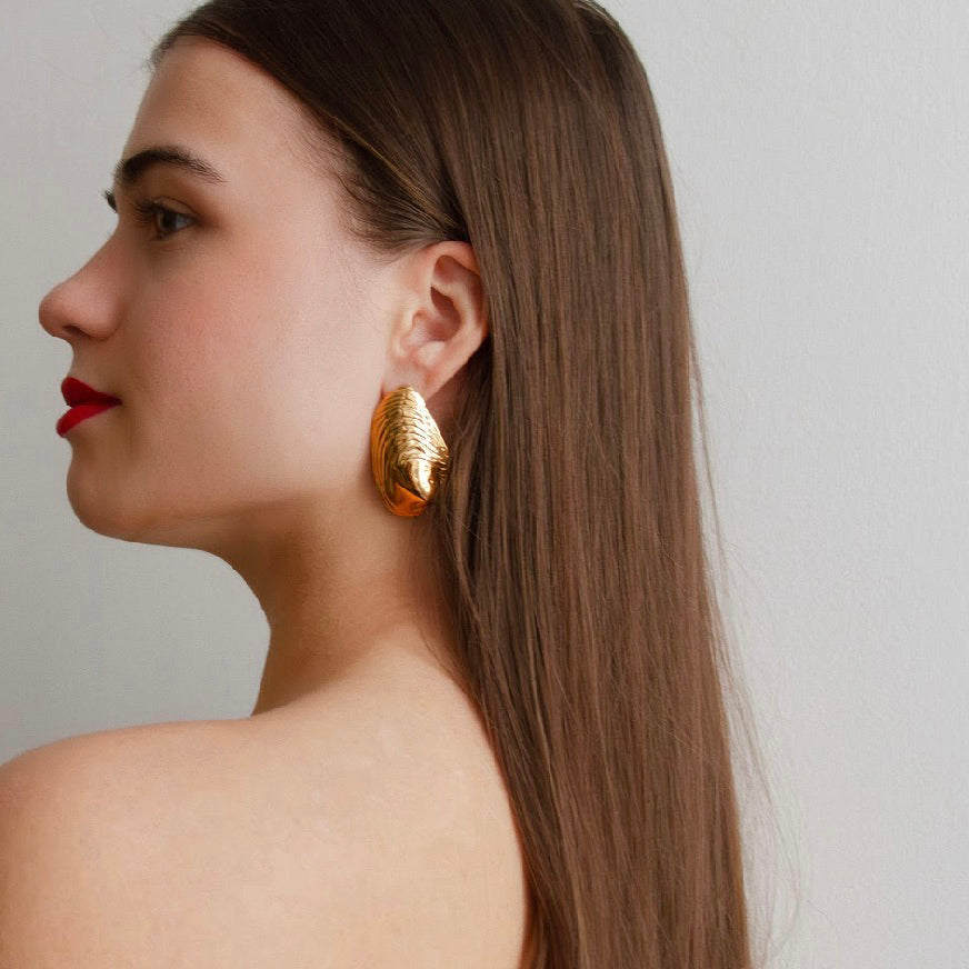 Inspired by the soft curves of ocean-carved shells, the Raya Earrings capture the effortless glow of sunlit shores. Their sculptural texture and high-shine finish make them a statement piece that feels both organic and timeless. Lightweight yet bold, they’re perfect for elevating any look — from linen days to evening glamour.