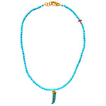 Bring playful charm and bold color to your jewelry collection with the Gigi Necklace. Hand-strung turquoise beads meet a vibrant horn-shaped pendant, finished with glossy hand-painted enamel in turquoise and red accents. The golden details add a touch of shine, balancing boho spirit with modern design.